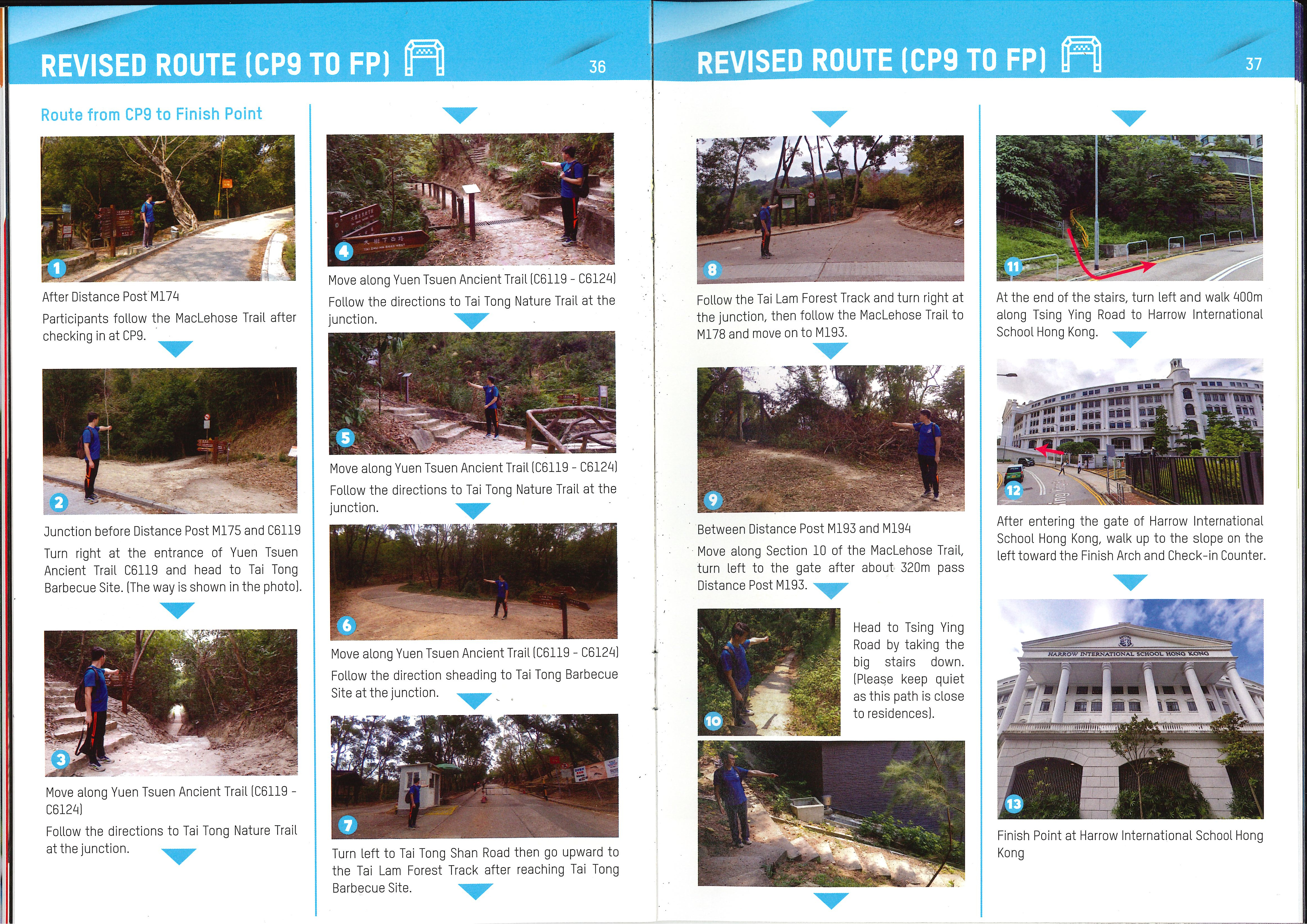The route covers sections 1 to 10 of the MacLehose Trail, from M001 – M174. After passing distance post M174 follow the Maclehose trail and turn right at the entrance of Yuen Tsuen Ancient Trail C6119. Move along Yuen Tsuen Ancient Trail (C6119 - C6124) and head to Tai Tong Barbecue Site. Turn left to Tai Tong Shan Road then go upward to the Tai Lam Forest Track after reaching Tai Tong Barbecue Site. Follow the Tai Lam Forest Track and turn right at the junction, then follow the Maclehose Trail to M178 and move on to M193. Head to Tsing Ying Road by taking the big stairs down. Turn left and walk to Harrow International School Hong Kong.